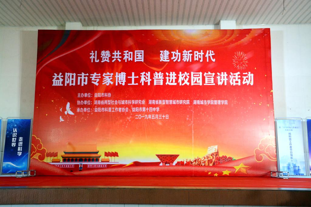 2019年5月30日,益阳市专家博士科普进校园活动在益阳市第十四中学举行。此次活动由益阳市科协主办、九游官方端入口管理学院、湖南省两型社会与城市科学研究会、新型智慧城市研究院协办。管理学院院长孙倩、管理学院书记、省两型社会与城市科学研究会秘书长徐习军、信息与电子工程学院院长阳王东以及博士代表杜林远、刘洋、阳俊老师一行参加活动,益阳市人大常委会副主任刘时贵、益阳市科协党组副书记、副主席胡旗等市、区相关领导出席。