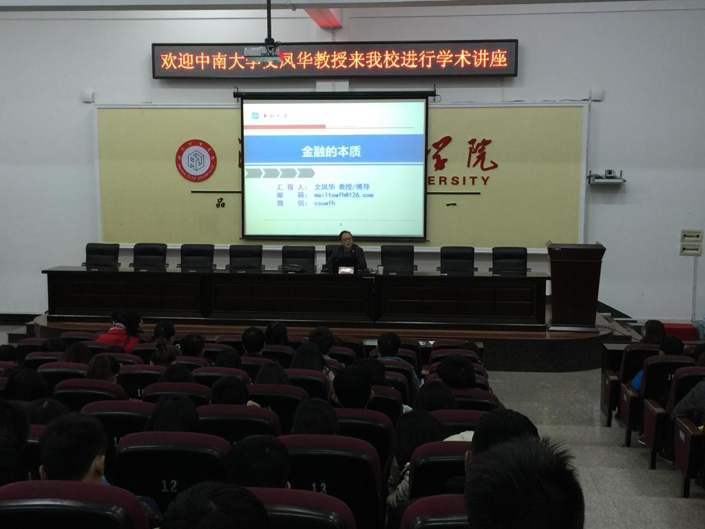 2015年12月22日下午3点,我校会龙学者,中南大学文凤华教授应邀来我院在电信楼视频会议室举行了主题为“金融本质”的学术讲座。本次讲座由商学院副院长孙倩老师主持,商学院党总支书记郭白泉老师、商学院院长汤腊梅教授以及商学院全体老师和200多位大三的学生参加了本次讲座。