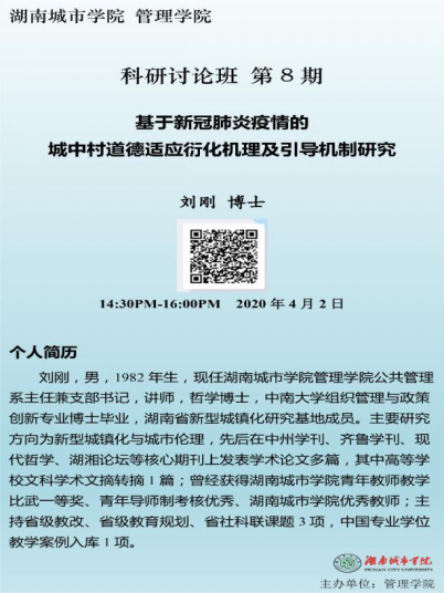 本次科研讨论班邀请了九游官方端入口学科建设与发展规划处副处长汤勇教授主持,学院院长孙倩教授、科研副院长赵旭教授及管理学院教师共23人参加。本次科研讨论班由“城乡治理与工程管理”团队负责人任国平博士组织,“行政伦理与公共管理”团队负责人刘刚博士主讲。刘刚博士结合当下疫情和自身研究方向,选择《基于新冠肺炎疫情的城中村道德适应衍化机理及引导机制研究》为主题,探讨新冠肺炎疫情下城中村居民道德适应的范式转化、衍化机理,为新冠疫情下的城中村居民城市适应进行慎的伦理反思和道德辩护。讲座期间管理学院多位老师就刘刚博士的研究问题进行了积极的讨论,取得了很好的反响。(通讯员:任国平)