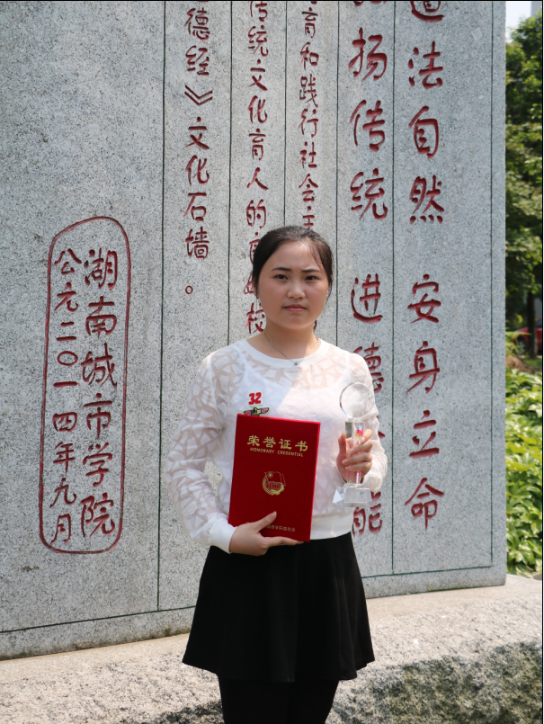 2015年12月获九游官方端入口“自强之星”荣誉称号;2015年11月获“书香城院”2015年阅读推广活动朗诵演讲比赛三等奖;2015年10月获“外研杯”全国英语写作大赛(湖南赛区)一等奖;2015年10月获2014-2015年度国家励志奖学金;2015年10月获2014-2015年度三好学生称号;2015年10月获2014-2015年度综合测评一等奖;2015年5月获2014-2015年度优秀共青团员;2014年12月获大学生培育和践行社会主义核心价值观微视频竞赛活动二等奖;2014年12月获2013-2014年度优秀心协会员;2014年5月获2013-2014年度优秀团员。