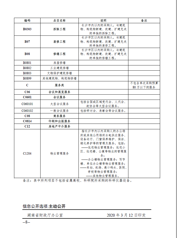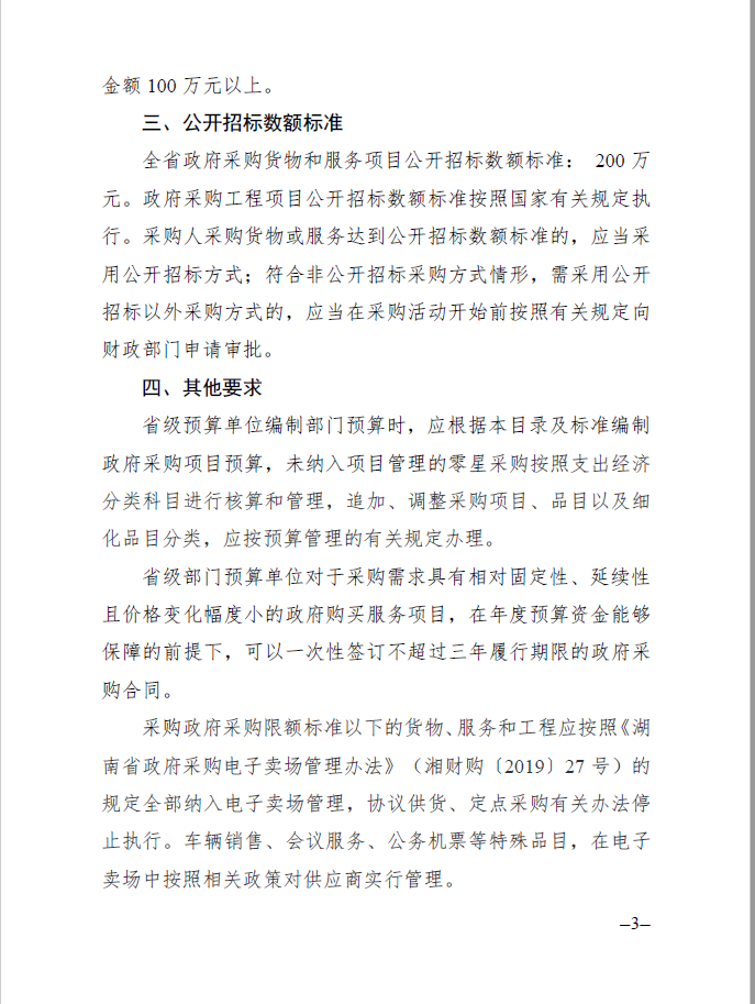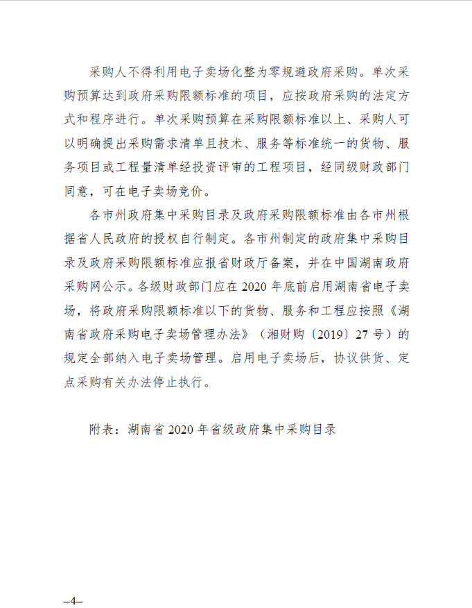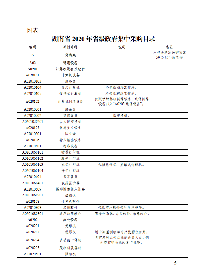 湖南省 2020 年省级政府集中采购目录及政府采购限额标准